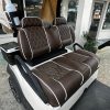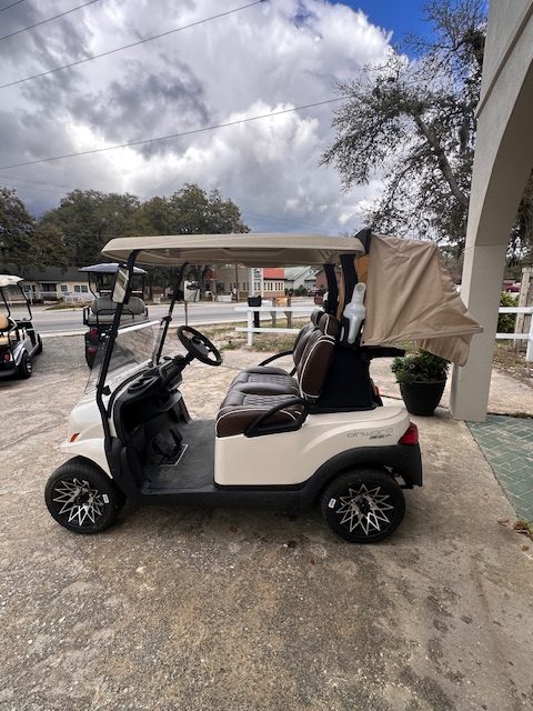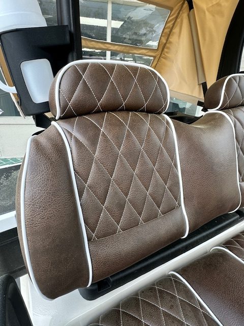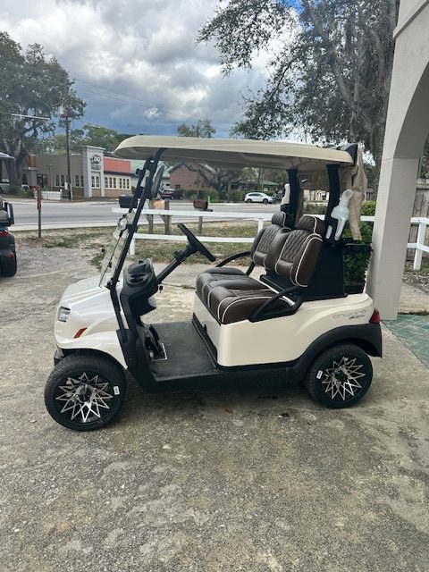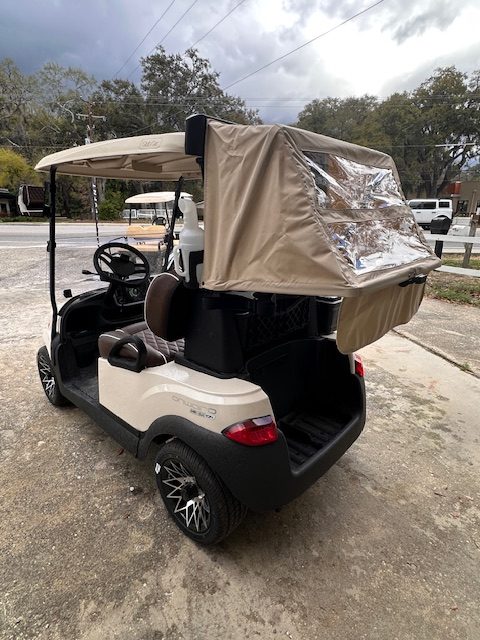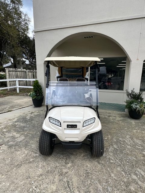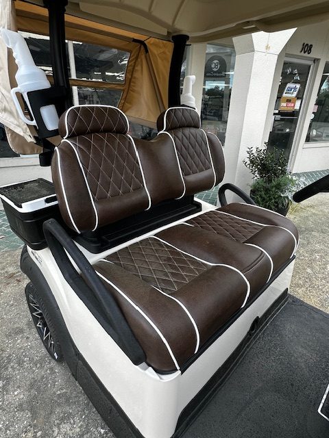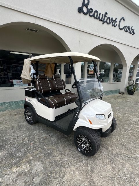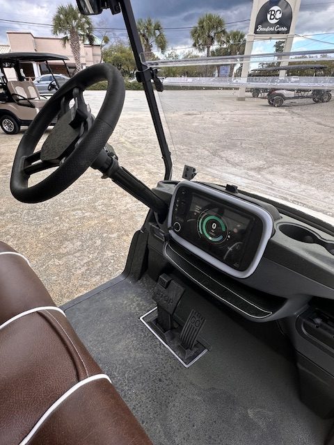 Features: Champagne with Brown Lazy Life Custom Seats. Onward 7” Touchscreen. Dual Sand Bottles and Premium Cooler. Lower Center Storage with Dual Wireless Phone Chargers. Golf Bag Magnetic Rain Cover. Premium Hinged Windshield. Li-Ion Battery Package. Deluxe Lights with Turn Signals. USB A and C Ports. Dual Sand Bottles. Premium cooler.