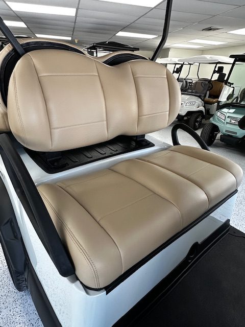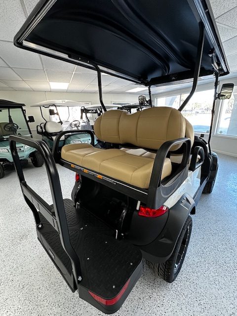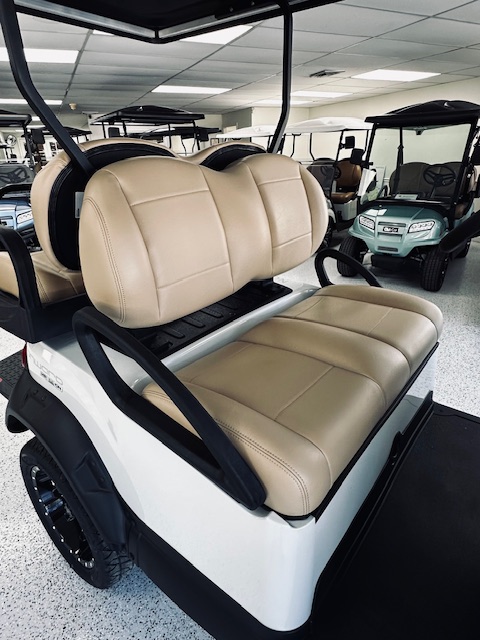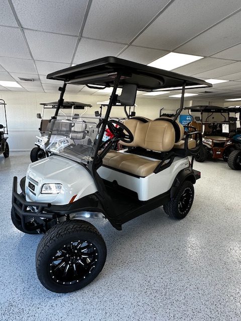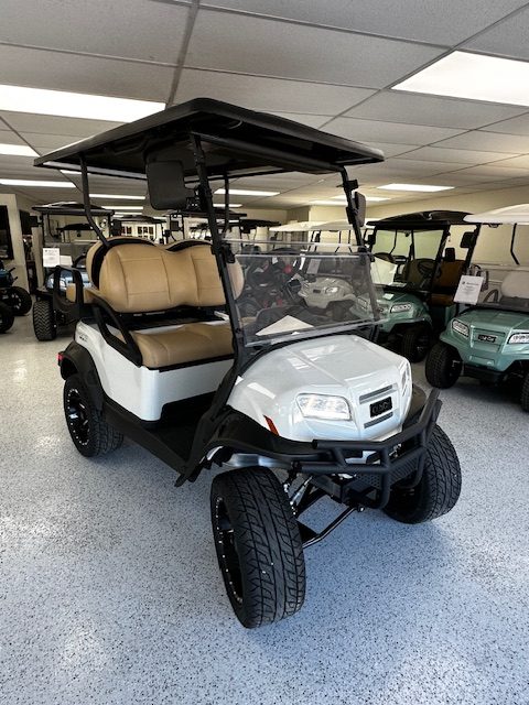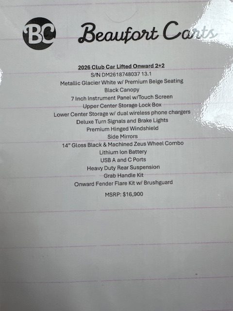 Features: Metallic Glacier White w/ Premium Beige Seating. Black Canopy. 7” Instrument Panel w/ Touch Screen. Upper Center Storage Lock Box. Lower Center Storage w/ Dual Wireless Phone Chargers. Deluxe Turn Signals and Brake Lights. Premium Hinged Windshield. Side Mirrors. 14” Gloss Black & Machined Zeus Wheel Combo. Lithium Ion Battery. USB A and C Ports. Heavy Duty Rear Suspension. Grab Handle Kit. Onward Fender Flare Kit w/ Brushguard.