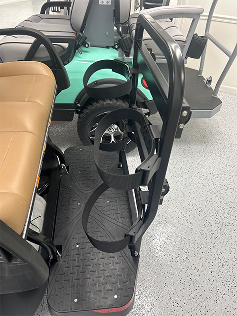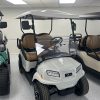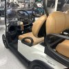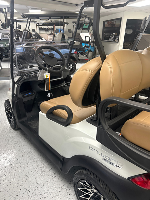 Features: Metallic glacier white with premium Camelo seating. 7 inch instrument panel with touchscreen. Lower center storage with dual wireless phone chargers. Premium hinged windshield. Side mirrors. Passenger grab handle. Machine and black hybrid wheels. Lithium ion battery. USPA and seaports. Heavy duty rear suspension. Full versa, attach rear golf kit, including sand bottle and cooler. Deluxe light kit with turn signals and LED headlights.